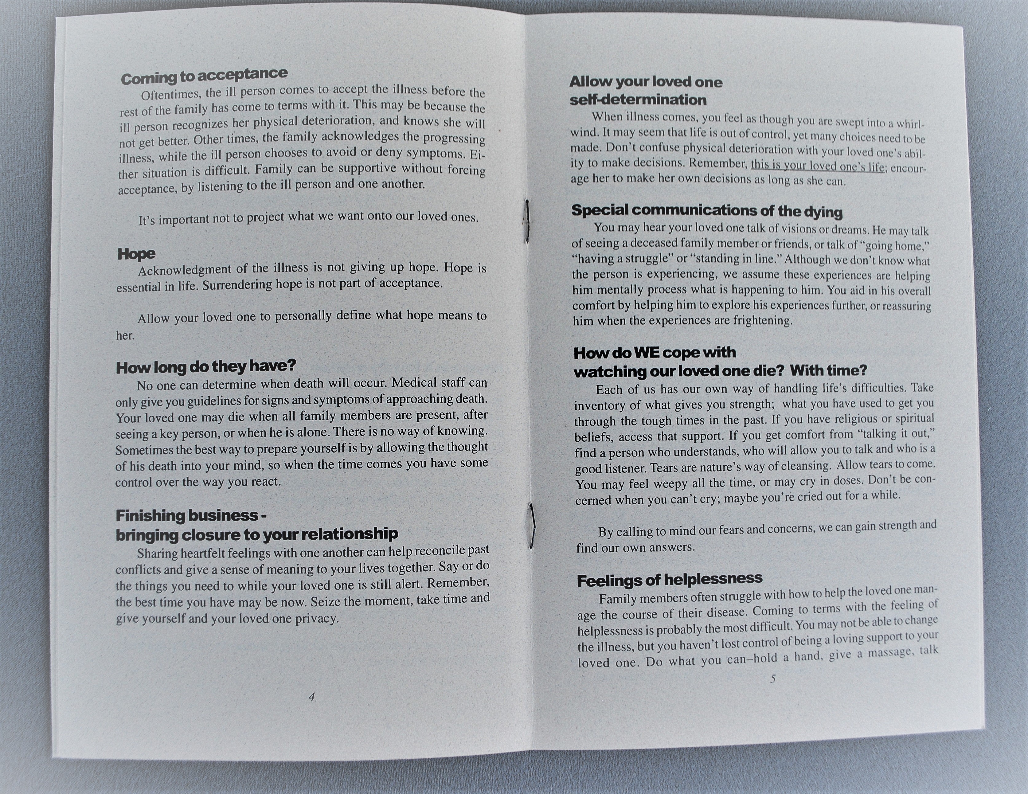“Excellent guides for caretakers and family members, to understand the journey and process of terminal illness. Clear and concise information. We include a copy in our admission packets.” Connie Lemon, Executive Director, Uplifted Care (formerly Hospice of Kankakee Valley)